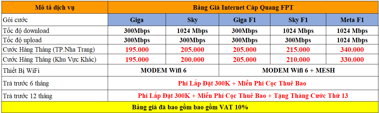 Trên địa bàn FPT ở Nha Trang, Cam Ranh, Cam Lâm, Diên Khánh, Ninh Hòa, Vạn Ninh đã được quang hóa hết toàn bộ, do đó khi khách hàng đăng ký sử dụng dịch vụ Internet FPT sẽ được cung cấp đường truyền cáp quang FPT tốc độ cao có thể lên đến 1024Mbp. Lắp đặt nhanh chóng trong vòng 24h, hỗ trợ kỹ thuật 24/24.